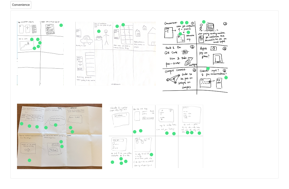 To determine site features, we used the Crazy 8’s method across three rounds focused on convenience, information, and privacy. From 79 ideas generated, team voting helped us narrow down to 5 key features: a product catalog, machine location info, a product dashboard, an AI chatbot, and a privacy pop-up.