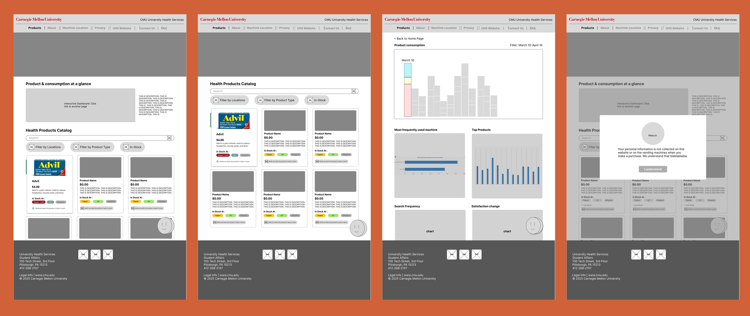 Based on user insights from testing, we developed a mid- to high- fi prototype. We applied a design system aligned with CMU branding to ensure consistency. This prototype excluded the AI chatbot and data dashboard, and introduced refined stock indicators, privacy banner and pop-up, image guides to machine locations, and a recurring mascot to enhance engagement.